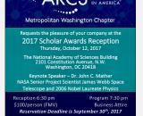 The Metropolitan Washington Chapter of ARCS Foundation, Inc. (ARCS/MWC) will be hosting its 48th annual Scholar Awards Reception sponsored by The American Institute of Aeronautics and Astronautics (AIAA) on the evening of Thursday, October 12, 2017. We are most grateful for the generous support from AIAA as sponsor. Given AIAA’s strategic commitment to engaged learning...