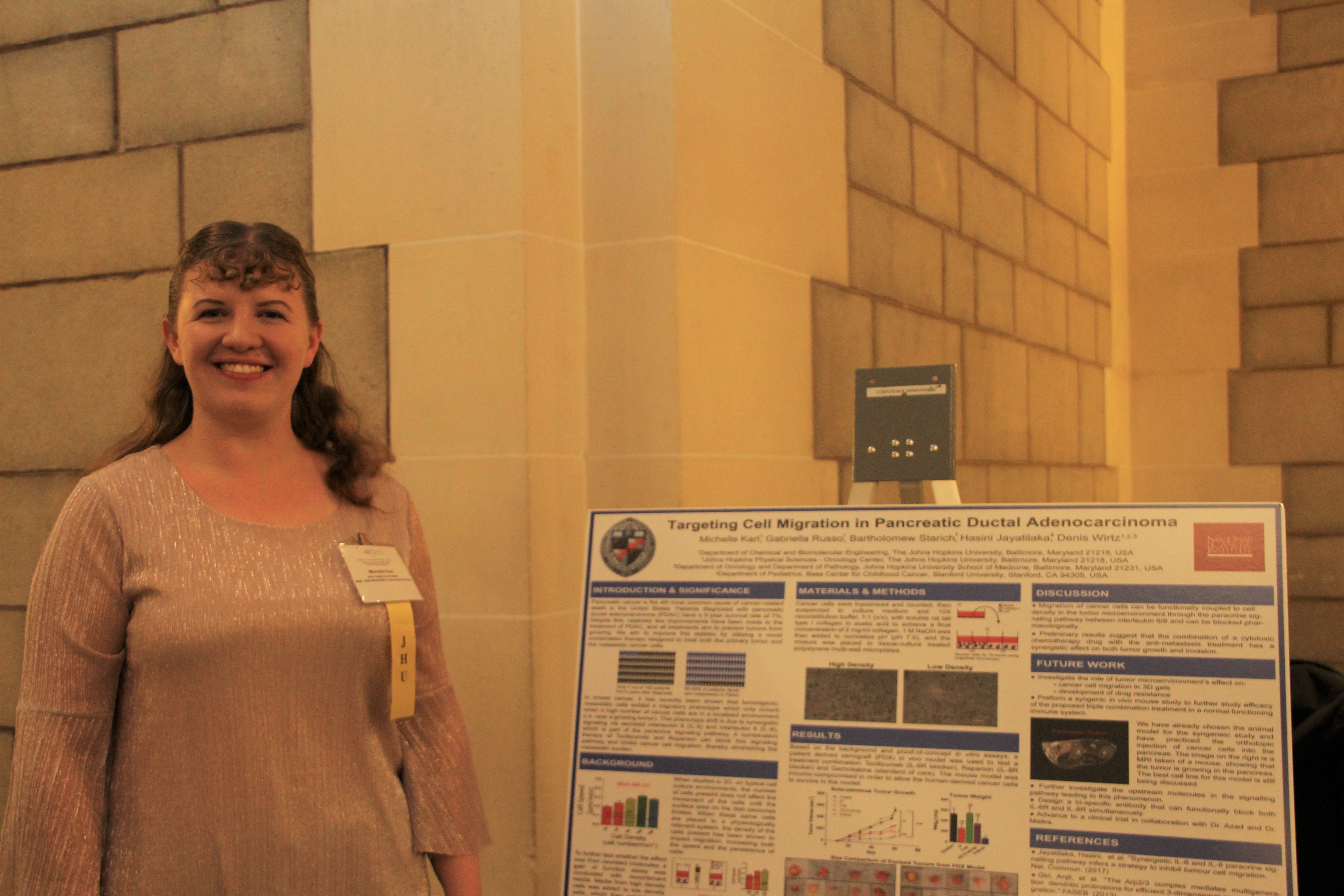 Michelle Karl is a first year scholar working towards her Ph.D. in Chemistry and Biomolecular Engineering at Johns Hopkins University. Ms. Karl is the 2018-19 MWC Endowment Scholar. Her research is utilizing three-dimensional substrates and mammalian cancer cells to study physiologically relevant cell behavior and signaling pathways in Pancreatic Ductal Adenocarcinoma, focusing on the steps in the metastasis, which are validated in clincally-relevant in vivo models.
