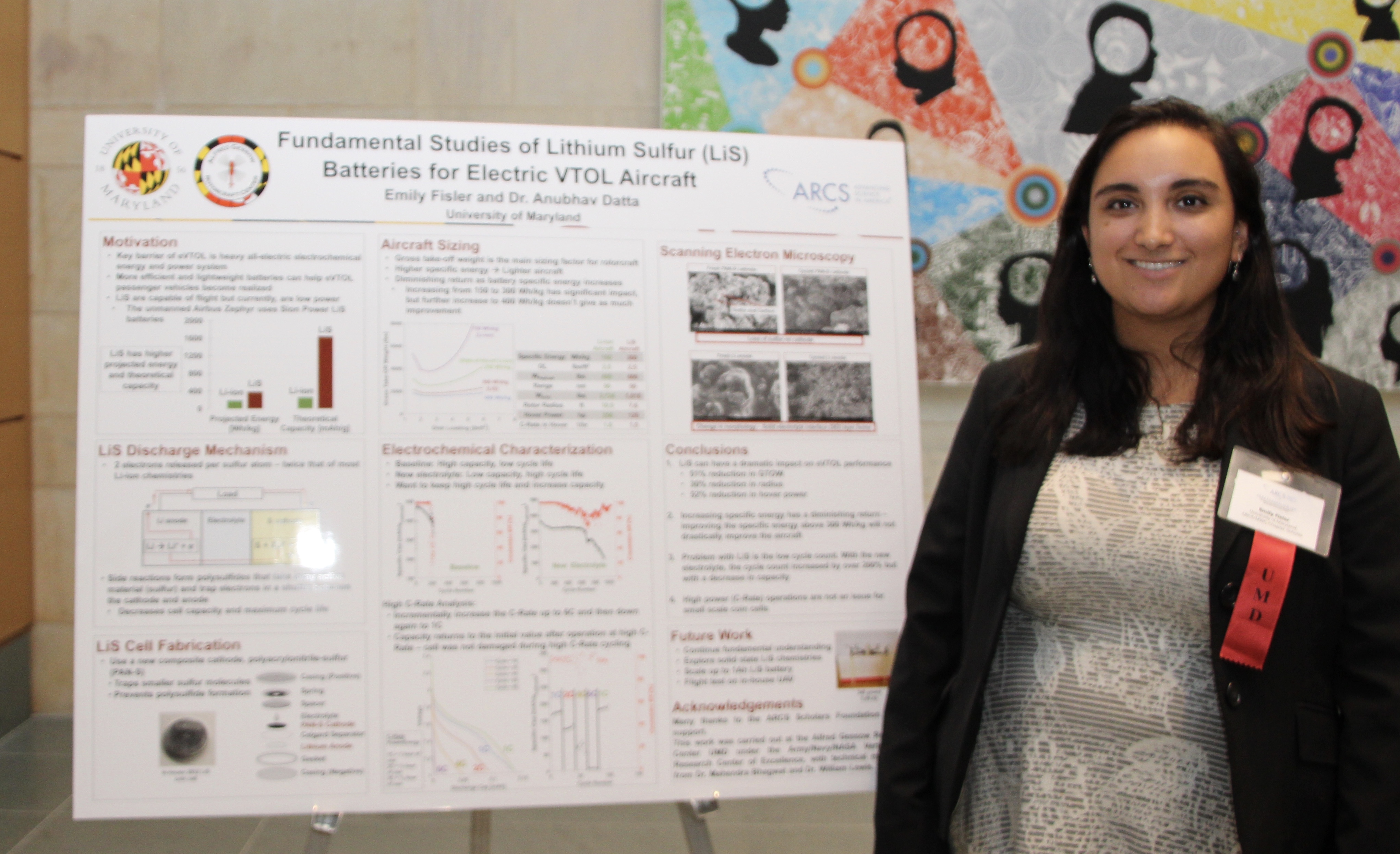 Emily E. Fisler, first year ARCS/MWC chapter scholar is a PhD candidate in aerospace engineering at the University of Maryland. Emily's research is on lithium-sulfur batteries used by electric takeoff and landing aircraft. Emily was inspired to study aerospace engineering by her grandfathter who worked in developing RTGs (power system) used in the Voyager spacecraft. Emily is also a licensed pilot with a love for helicopters. She understands how important it is to spark interest in engineering at a young age, so is involved in outreach programs and organizations such as Women in Aeronautics and Astronautics.